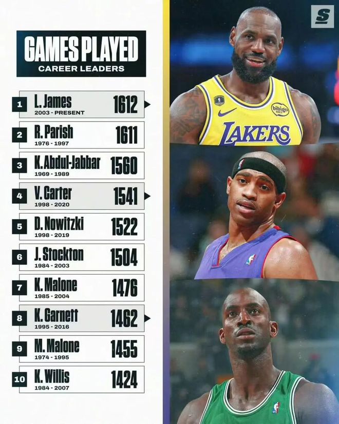 常規賽出場數達1612場,獨享歷史第1