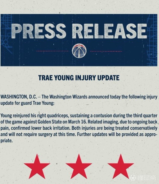 特雷-杨在3月16日对阵勇士的比赛中受伤,他的右股四头肌挫伤,同时他还出现了下背部反复刺激的情况。这两处伤病都将采用保守治疗的手段,不会进行手术。后续伤情将视情况公布。