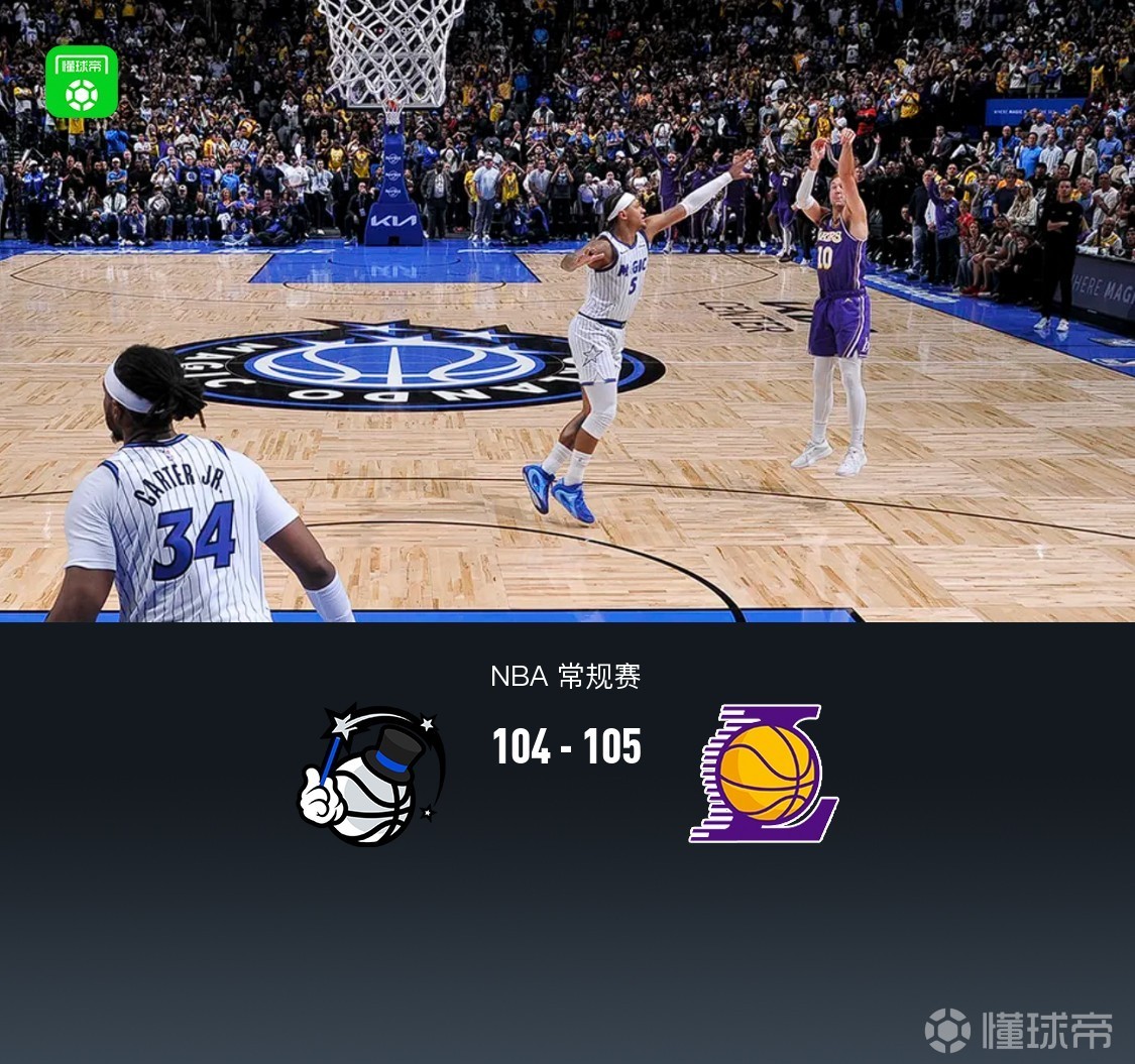 第四节,开节段湖人詹姆斯、里夫斯带队咬住分差,节中段湖人里夫斯连突带投连得7分反超比分,魔术卡特、班凯罗强杀内线保持微弱领先,比赛最后阶段魔术领先2分,湖人詹姆斯造成魔术发边线球失误,还剩4.1秒詹姆斯空切内线遭班凯罗封盖,还剩2.6秒肯纳德出现空位三分绝杀,全场结束,湖人105-104魔术。