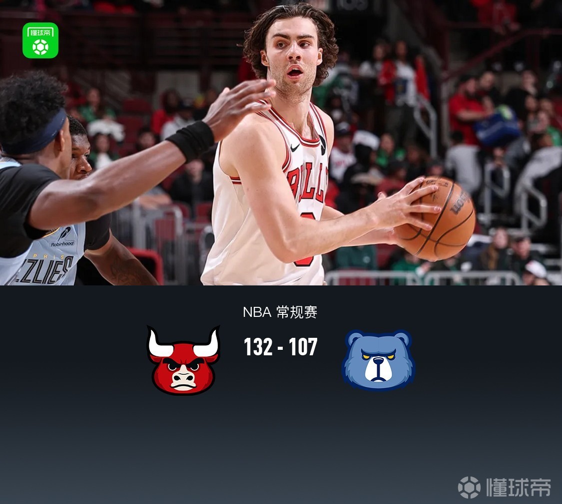 第四节公牛迪林厄姆拿下10分,灰熊杰伦-威尔斯拿下5分,最终公牛132-107战胜灰熊