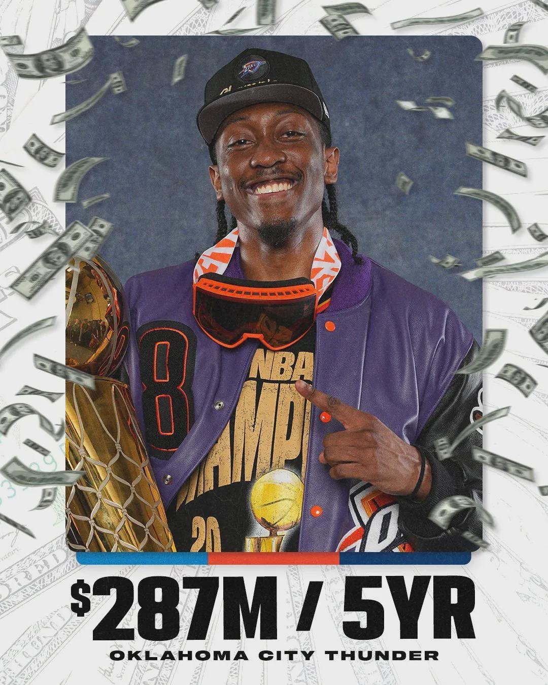 2025年夏天,雷霆5年2.39亿美元续约杰伦-威廉姆斯。如果他在本赛季入选最佳阵容,哪怕是三阵,这份合同都将变成5年2.87亿美元。可惜杰威被右腿筋伤势长期困扰,不仅个人数据下滑,出勤率也不够,他跟切特一样拿5年2.39亿。