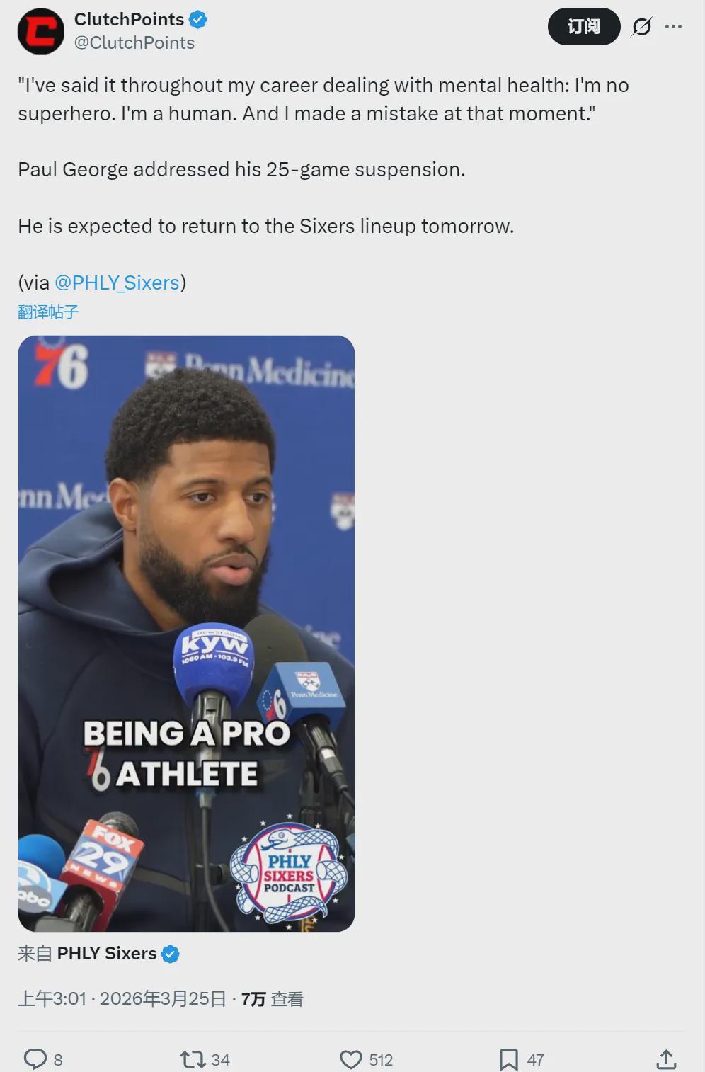 北京时间3月25日,据76人随队记者Austin Krell报道,保罗-乔治25场禁赛结束,他将在明天对阵公牛的比赛中正式复出。今天乔治接受采访时确认了这一消息:“我的膝盖恢复得不错,已经回归正常水准,准备好明天出战了。”