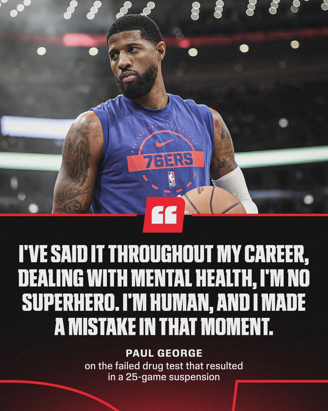 今年2月1日,NBA官方宣布,乔治因违反联盟禁药政策,被联盟禁赛25场。当时乔治表示,为了治疗心理健康,自己误服了联盟违规的药物。今天乔治再次回应:“我不是超级英雄,我只是个普通人。而那一刻,我犯了个错误。”
