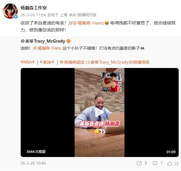 北京时间3月26日,NBA名宿、前火箭球星麦迪更新中文社媒,盛赞杨瀚森NBA生涯至今的表现,并对杨瀚森的前景充满期待。