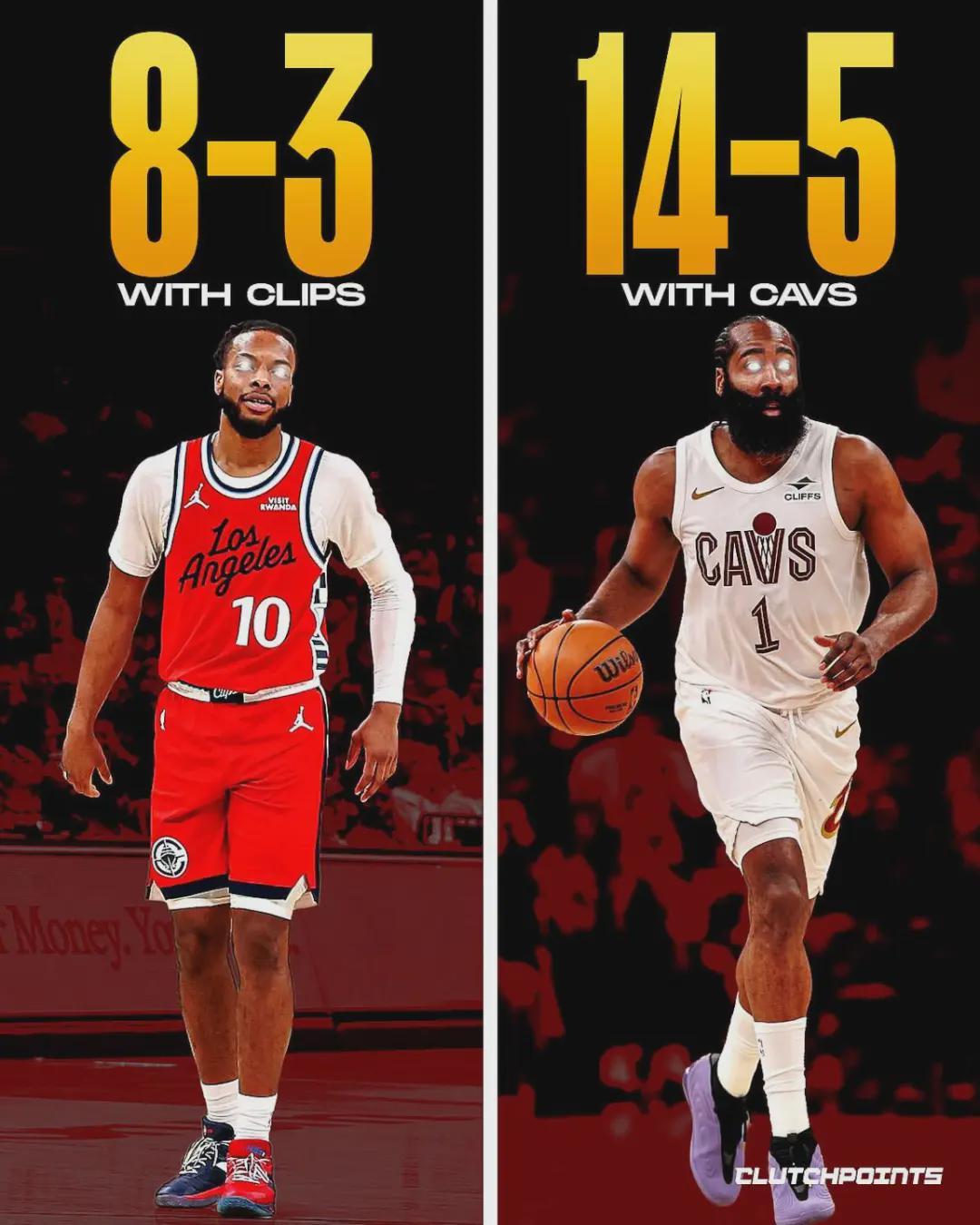 哈登在骑士打了19场,球队14胜5负。哈登场均出战34.4分钟,得到21分5.4篮板7.7助攻0.7抢断3.4失误。投篮命中率48.2%,三分命中率45.2%,罚球命中率82.9%。场均得分比他在快船时下降,投篮命中率和三分命中率明显提升。