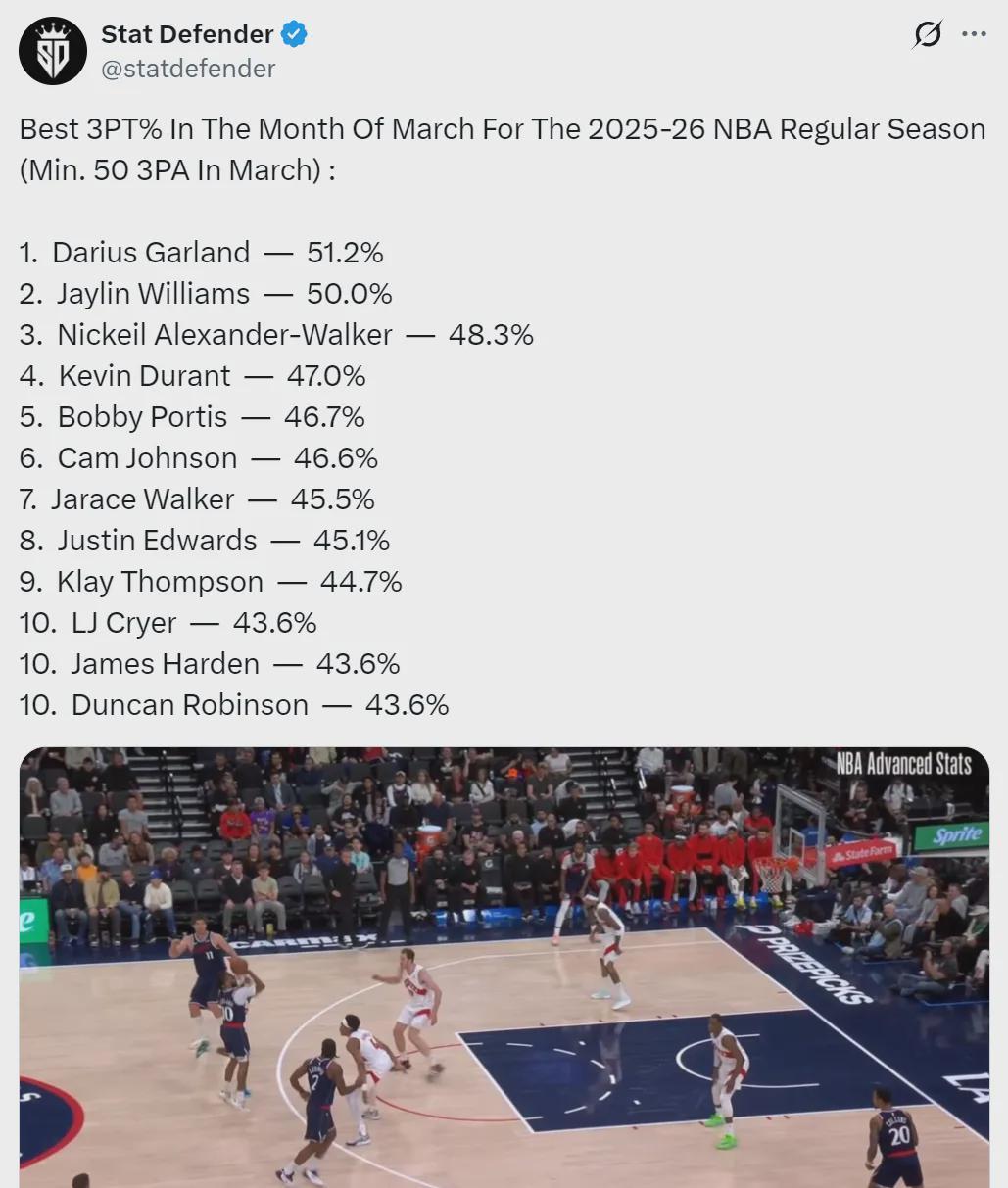 进入3月份以来,NBA三分最准的球员是谁?估计很多人都猜不到,快船后卫加兰的三分命中率领跑全联盟。3月份三分命中率排行榜(至少出手50次):1、加兰51.2%;2、杰林-威廉姆斯50%;3、亚历山大-沃克48.3%。