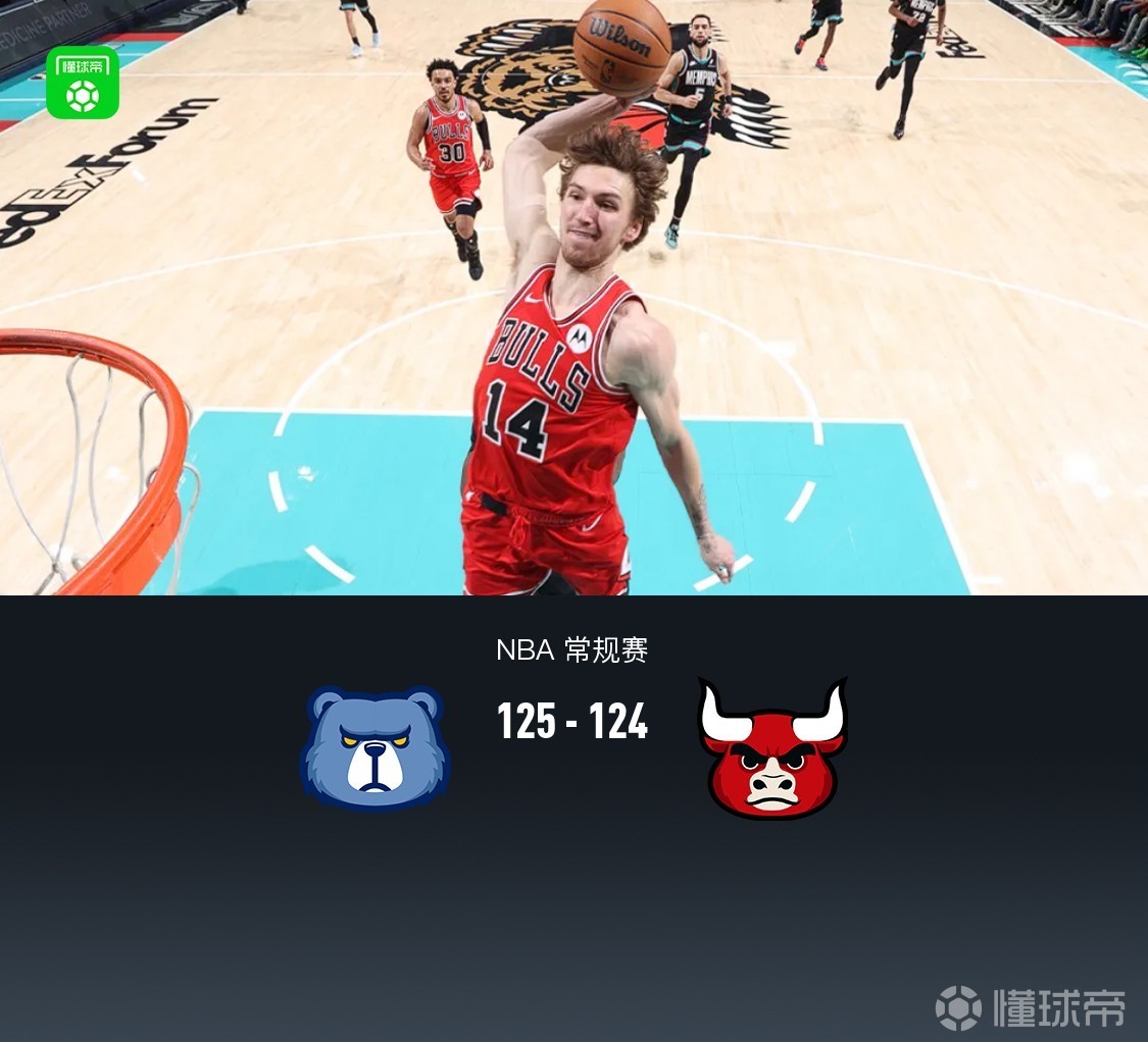 第四节,开节公牛琼斯、迪林汉姆相继三分追至4分,灰熊考沃德、普罗斯珀回应再度拉大至9分,紧跟公牛布泽利斯、塞克斯顿一波13-0直接反超4分,灰熊杰克逊冲框连得4分追平,随后双方拉锯,关键时刻灰熊克莱顿命中三分领先3分,最后15秒犯规战术,最后阶段灰熊领先1分,发球失误,公牛抢断反击塞克斯顿绝杀超时,最终灰熊125-124战胜公牛。