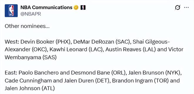 西部:佈克(太陽)、德羅贊(國王)、 亞歷山大(雷霆)、萊昂納德(快船)、裡夫斯(湖人)、文班亞馬(馬刺)。