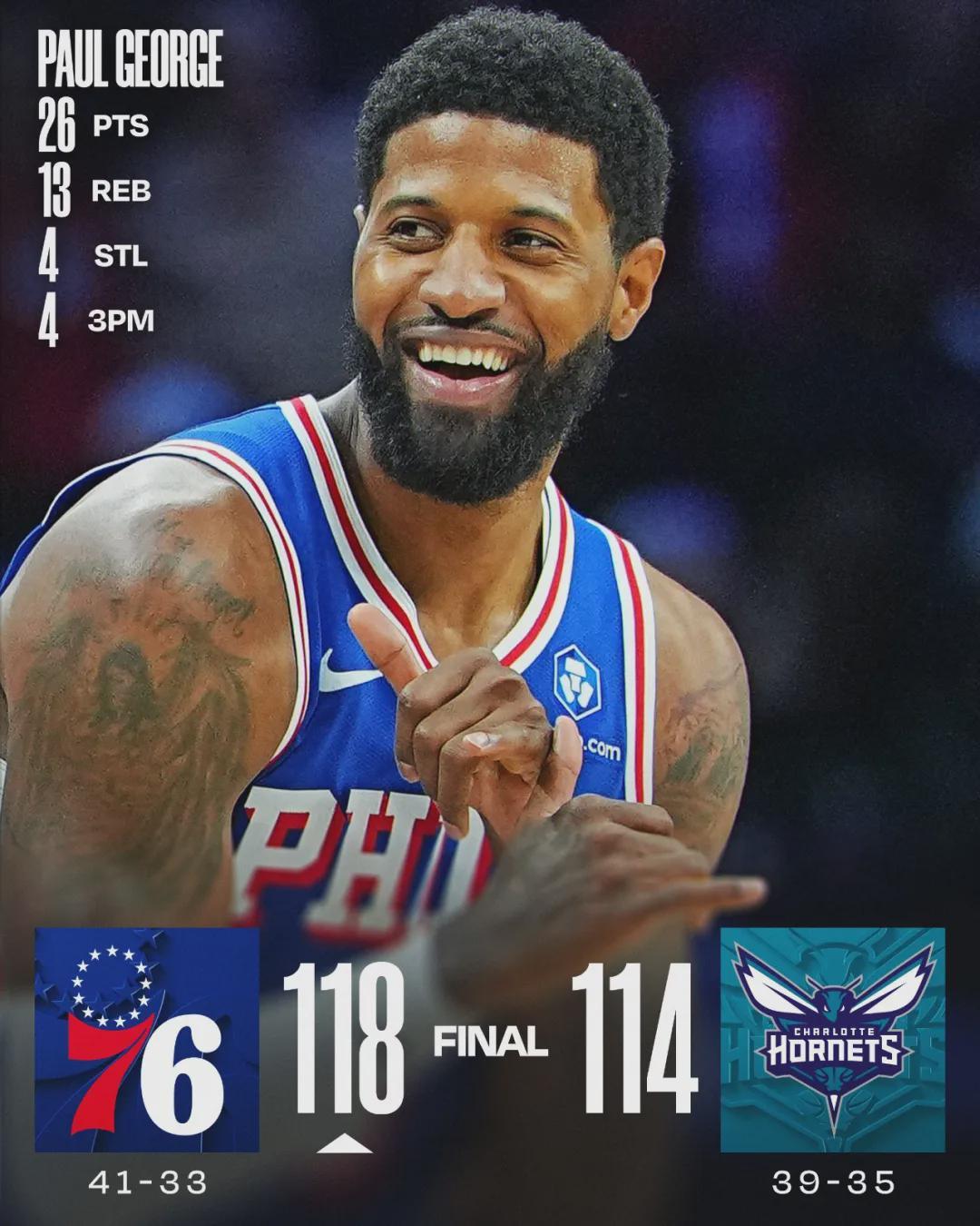 此役恩比德拿到29分6篮板2助攻2盖帽,马克西26分7篮板8助攻1抢断1盖帽,乔治26分13篮板2助攻4抢断1盖帽。此前乔治被禁赛25场,复出之后打了两场比赛,场均27分9.5篮板3助攻4抢断,投篮命中率48.7%,三分命中率41.6%。