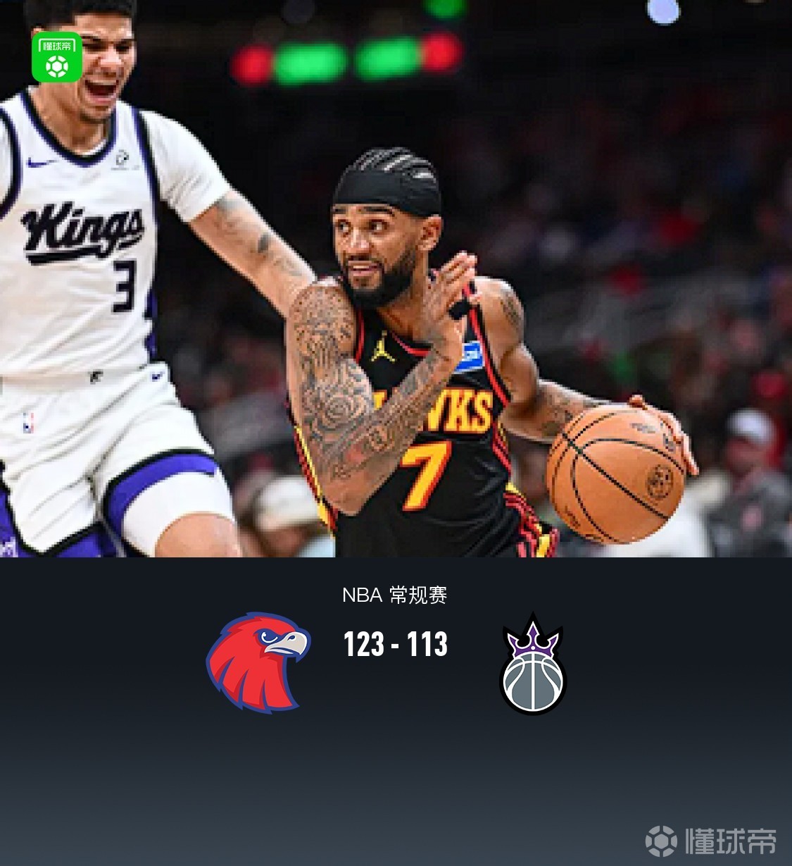 北京时间3月29日NBA 常规赛,亚特兰大老鹰对阵萨克拉门托国王。半场老鹰66-54国王,第三节结束国王追至6分分差,末节国王一度追平,但紧跟老鹰约翰逊、沃克联手一波11-0再度拉开分差,最终老鹰123-113国王。