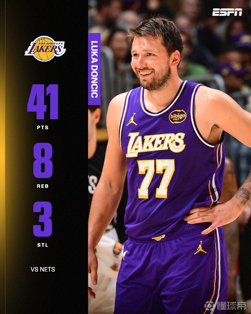 北京时间3月28日,NBA常规赛洛杉矶湖人主场116-99战胜布鲁克林篮网,东契奇全场25投15中,砍下41分8篮板3助攻。