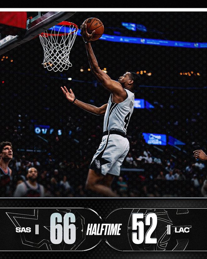 馬刺隊的文班亞馬上半場得到13分和8個籃板,卡斯爾得到12分、4個籃板和5次助攻,福克斯得到8分和5次助攻;快船隊的加蘭得到12分和4次助攻,馬瑟林得到10分。