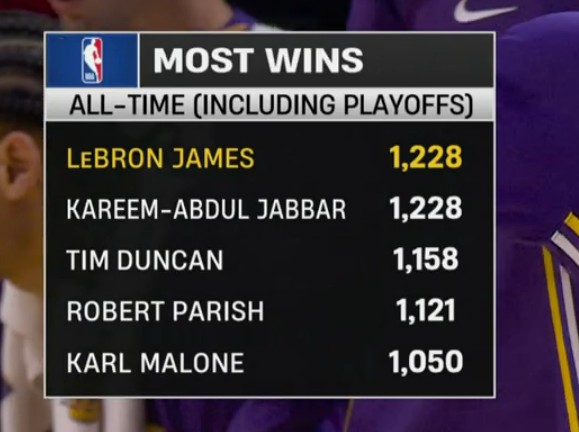 赛后根据统计,本场比赛胜利也是现年41岁的詹姆斯职业生涯至今在NBA拿到的第1228胜(包含季后赛),这也让他追平了贾巴尔,并列成为NBA历史取胜场次最多的球员。