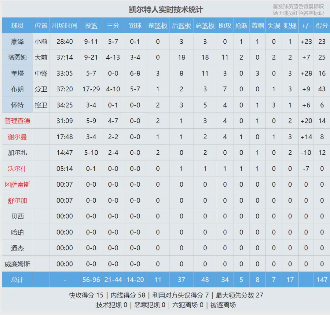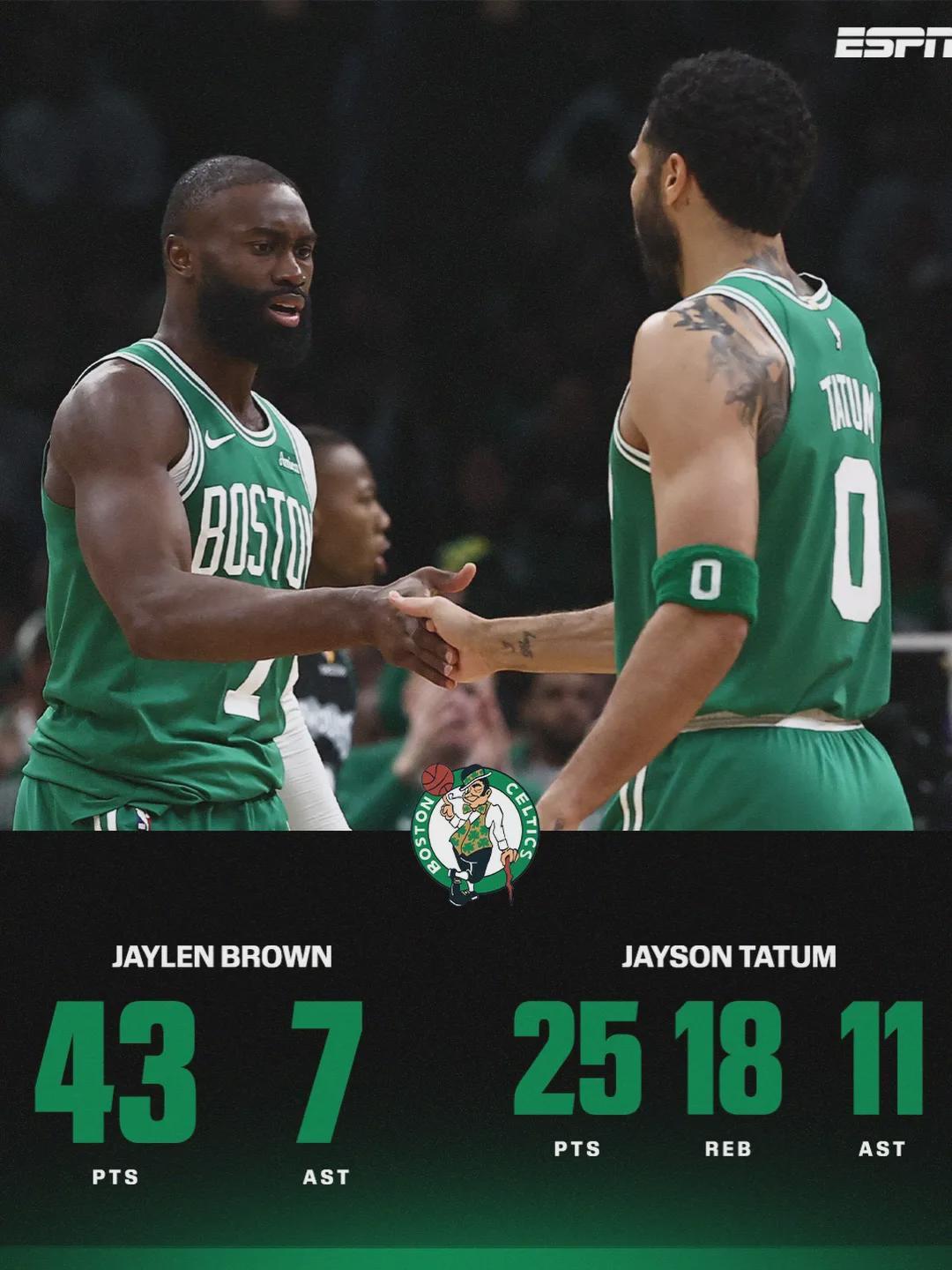 阿德巴约21投10中,三分10中5,罚球8中4,拿到29分10板2助2断,正负值-23并列全场最低。绿军双探花爆发:杰伦-布朗29投17中,三分10中4,罚球7中5,砍下43分4板7助。他本赛季7次砍下40+,此前9个赛季一共10次。
