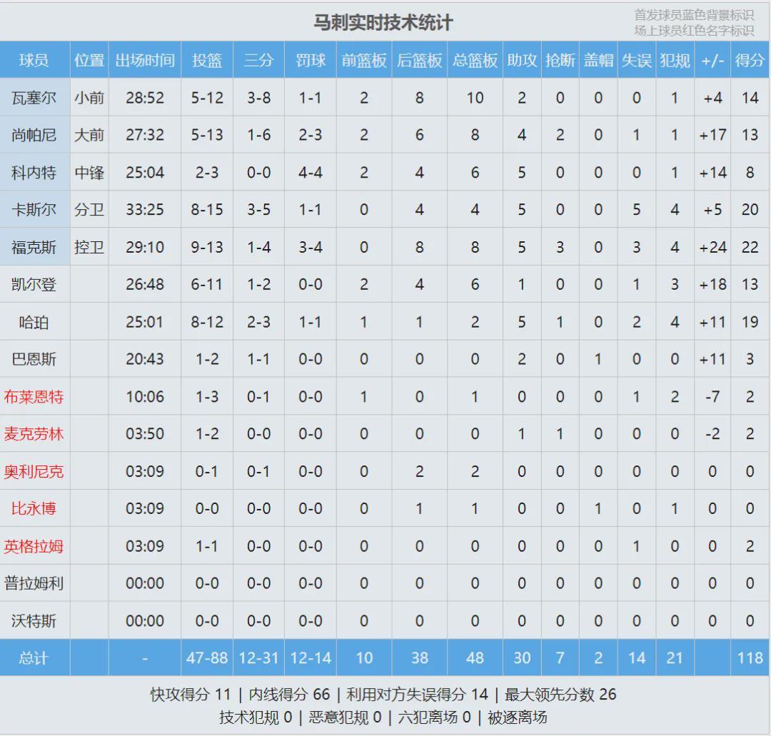 马刺三后卫一起爆发:福克斯13投9中,砍下22分8板5助3抢断3失误,正负值+24全场最高;卡斯尔15投8中,得到20分4板5助5失误;哈珀12投8中,替补砍下19分2板5助2失误。对面的加兰,被防到17中5仅得11分2板3助。