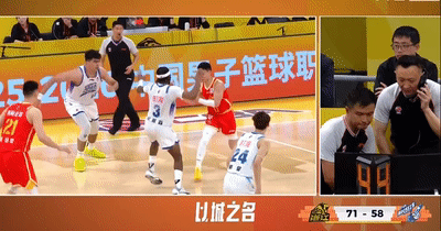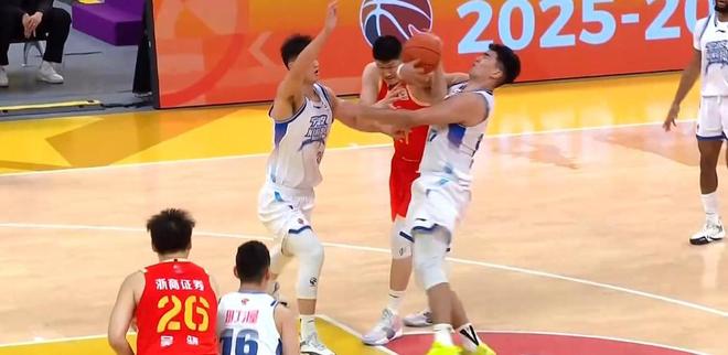 在本場比賽貢獻瞭16分3板的胡金秋於末節持球進攻的時候突然被包夾。