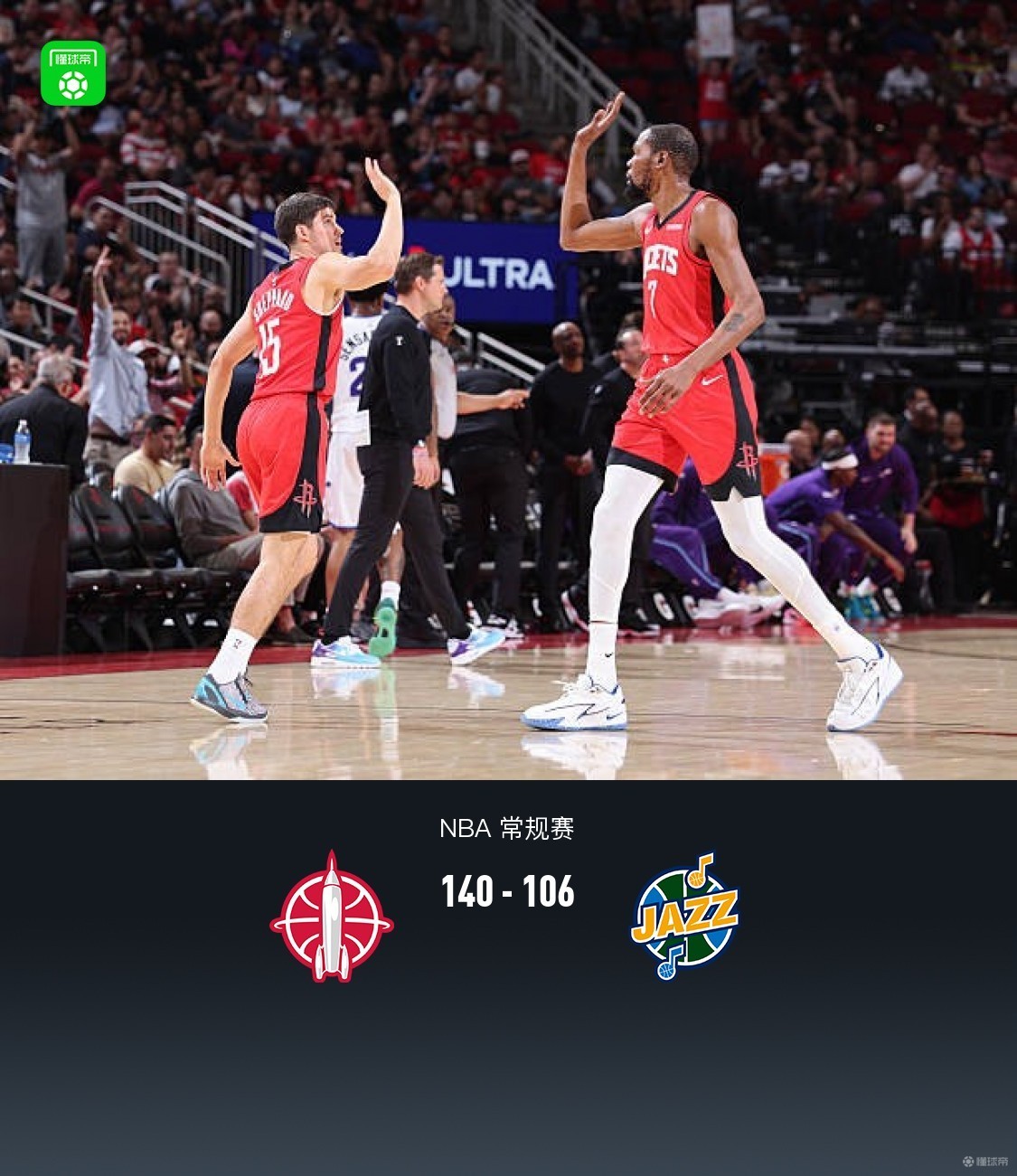 第四节火箭杰肖恩-泰特拿下7分,爵士埃斯-贝利拿下13分,最终火箭140-106战胜爵士