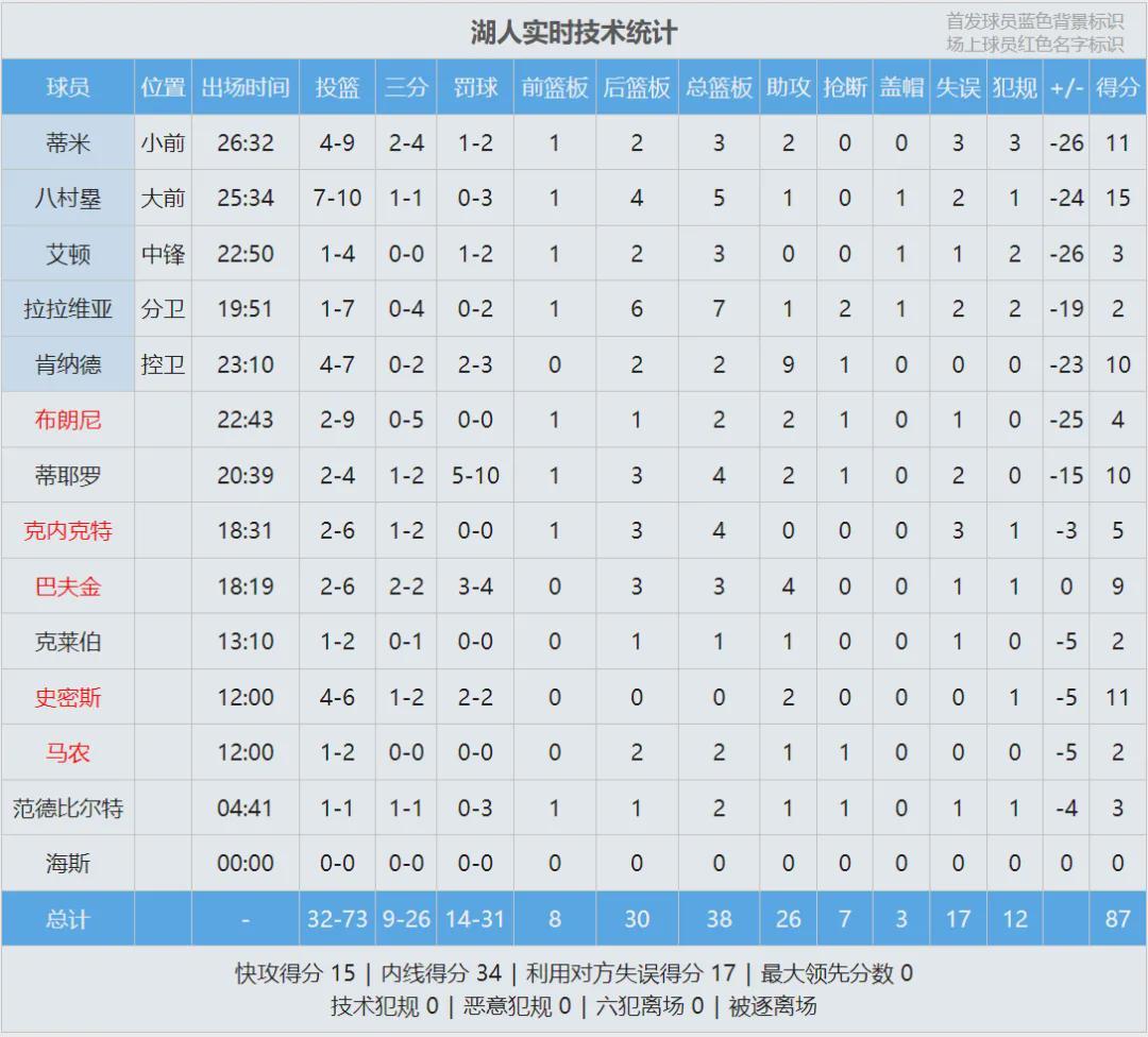 湖人继续排名西部第四,落后掘金1个胜场。最后看看数据,说说你的感受: