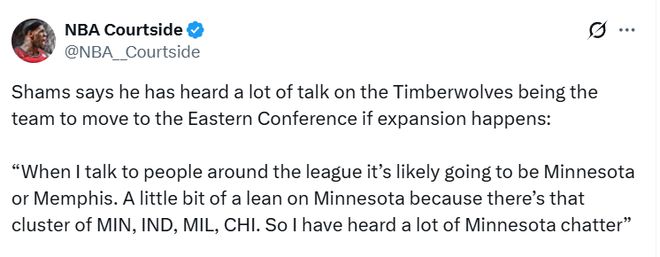 Shams在節目上說道:“跟NBA圈內人聊下來,大概率是森林狼或者灰熊,更偏向森林狼,因為地理位置:森林狼、雄鹿、步行者、公牛紮堆在中部。當然,灰熊、鵜鶘也覺得自己有理由。很多人問我:會不會有球隊搬遷?我報道裡也寫瞭,大概率就是森林狼或灰熊。大傢還在討論擴軍選秀、受保護球員名單。但說實話,這些都是兩三年後的事,到時球員名單早就變瞭。不過擴軍選秀那天一定會很好看。”