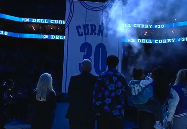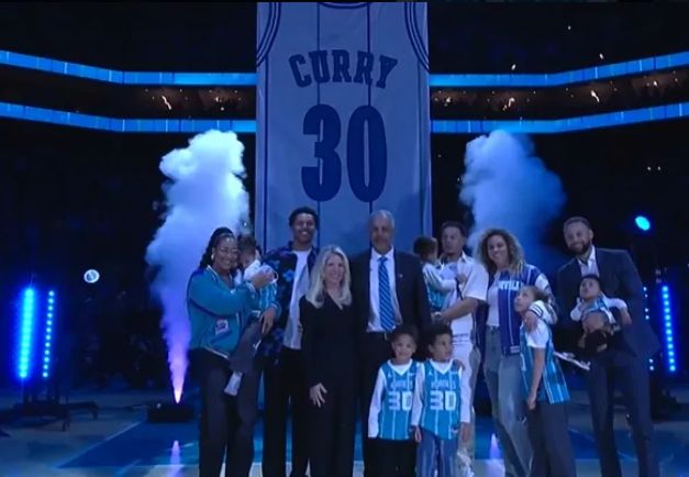 如今黃蜂主場為戴爾-庫裡舉辦30號球衣退役儀式,庫裡全傢人到場見證父親的榮耀時刻,見證30號球衣冉冉升空,並且全傢一起合影留念。