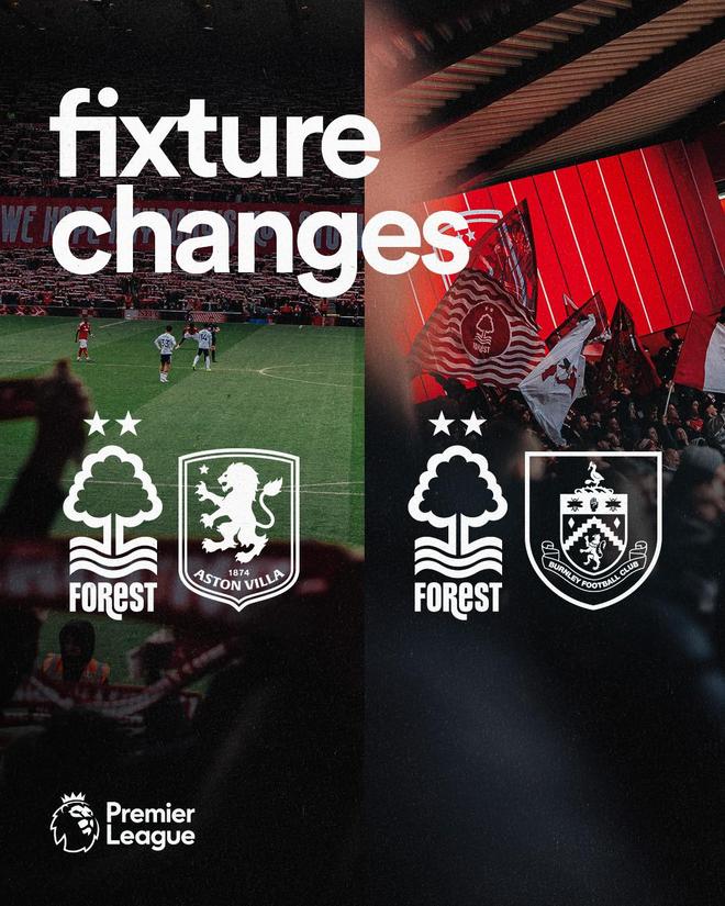 北京時間3月20日,根據官方消息,隨著諾丁漢森林晉級歐聯杯八強,原定於下周末對陣阿斯頓維拉的比賽將改至4月12日舉行,伯恩利客場之戰將改至4月19日舉行。
