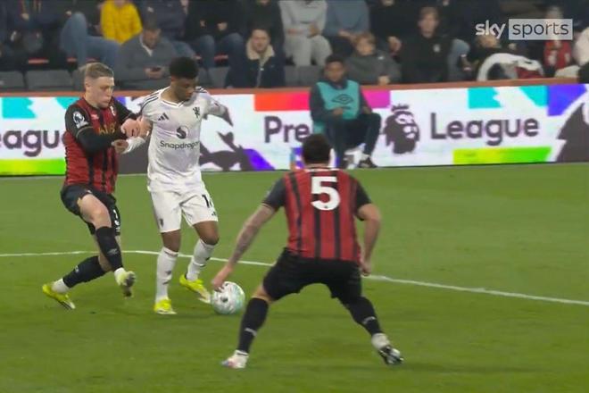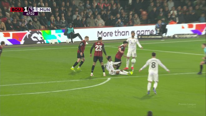 當時,1-0領先的曼聯攻入伯恩茅斯禁區,佈魯諾·費爾南德斯妙傳阿馬德·迪亞洛,後者順勢帶入禁區,在阿德裡安·特魯弗爾又拉又推之下倒地瞭。主裁斯圖爾特·阿特維爾沒有吹犯規,伯恩茅斯得球反擊,並且取得進球。
