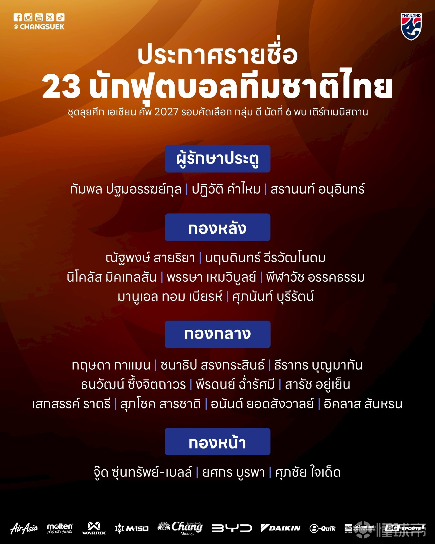 泰国公布了3月参加亚洲杯预选赛的23人名单,其中德乙球员米克尔森在列,3名海外球员入选。