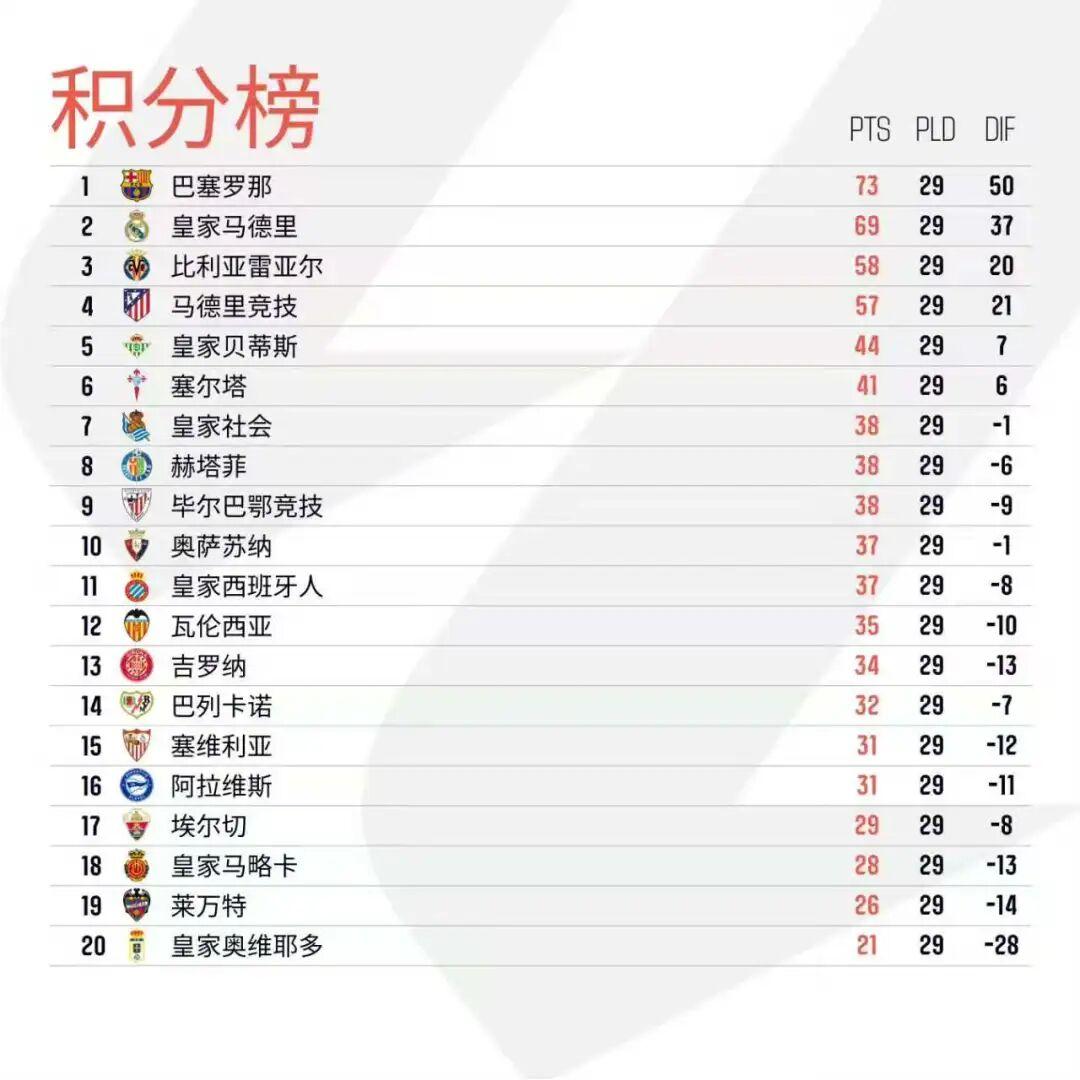 北京时间3月23日凌晨,西甲第29轮10场结束全部较量。本轮焦点对话自然是“马德里德比”,皇家马德里最终3比2力克马德里竞技报第一回合一箭之仇,继续排名第二的同时,与马竞的分差也来到了11分;巴塞罗那凭借阿劳霍的进球,1球小胜巴列卡诺继续领跑西甲;比利亚雷亚尔3比1击败皇家社会,实现了对马竞的反超;而皇家贝蒂斯本轮1比2负于毕尔巴鄂竞技,已经落后欧冠区达13分,机会愈发渺茫。