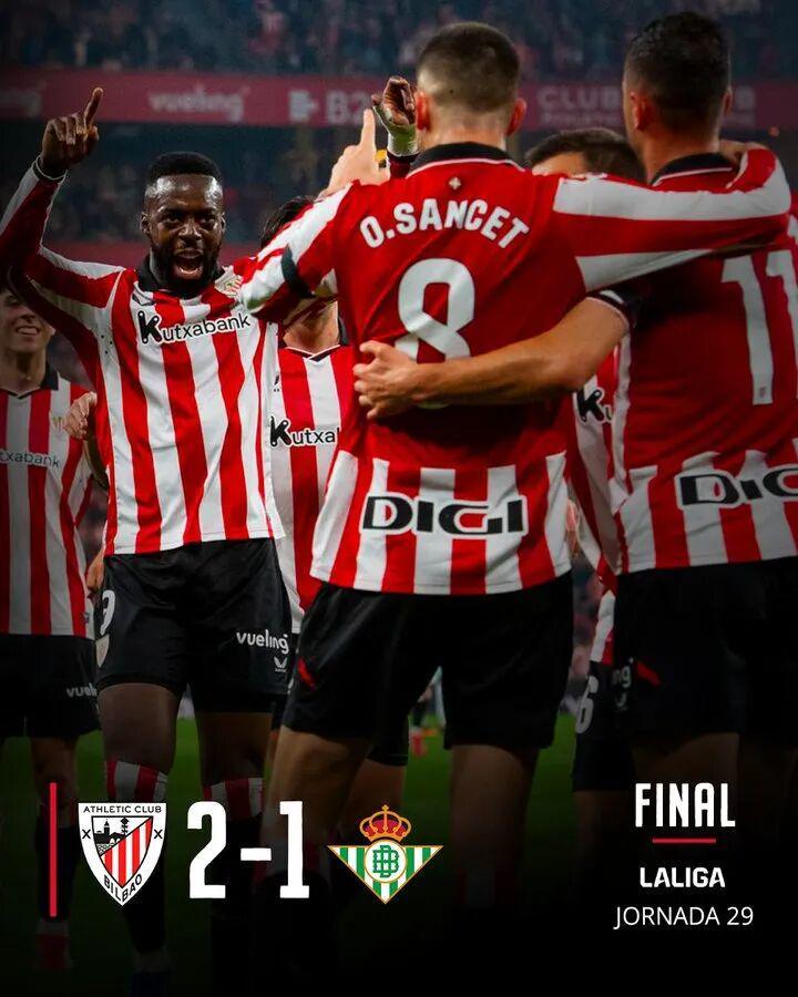 北京时间3月23日凌晨1点30分,毕尔巴鄂竞技主场迎战皇家贝蒂斯。上半场比赛,伊尼亚基·威廉斯回做,维维安远射先下一城,随后前者带球扫向门前,桑切特包抄破门扩大比分,福尔纳尔斯精彩任意球扳回一城。最终,毕尔巴鄂竞技2比1击败皇家贝蒂斯,送对手联赛5轮不胜。