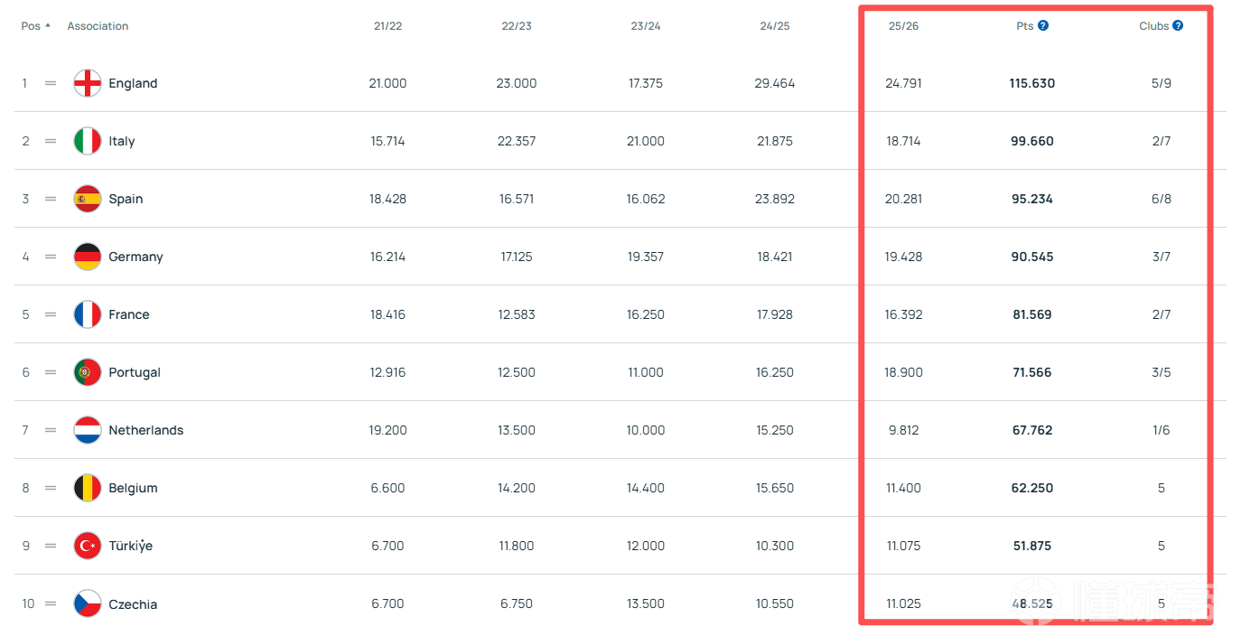 在欧足联近五年欧战系数排行榜上,英超以巨大的优势遥遥领先于其他联赛。OPTA曾在淘汰赛首回合结束时做出预测,英格兰最终排在赛季系数排名前两位的概率仍然高达99.9%,意味着即使英格兰球队输掉剩余的所有欧战比赛,其他联赛也很难超越他们目前的平均系数。长此以往,英超第五名实际上可能会成为一个永久性的欧冠席位。