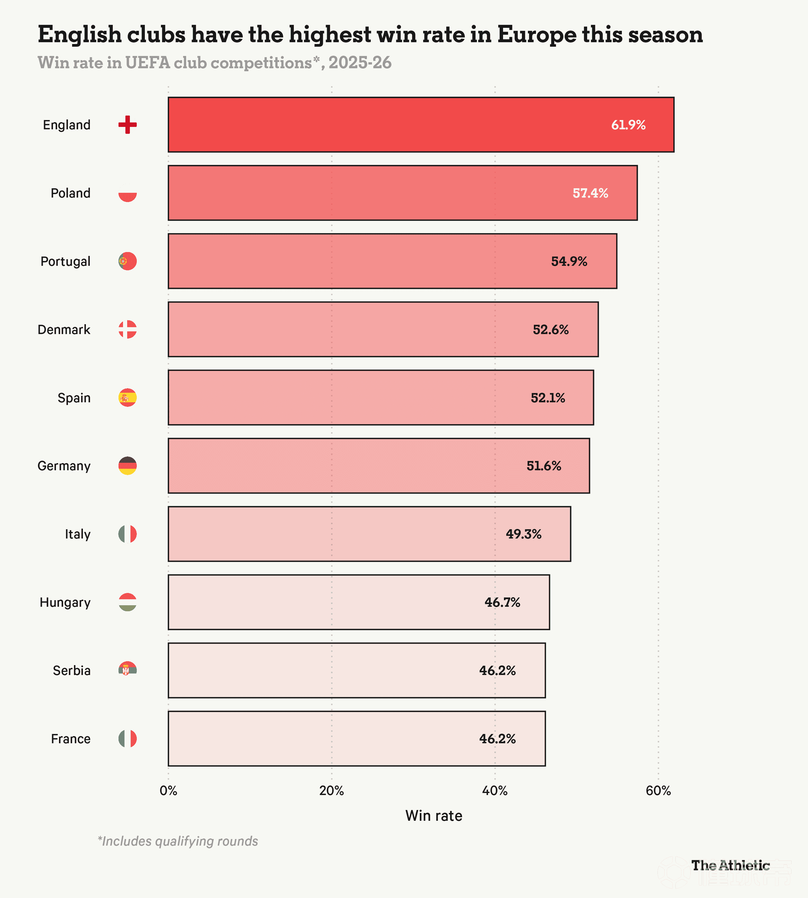 截至淘汰赛首轮的各大联赛欧冠胜率统计