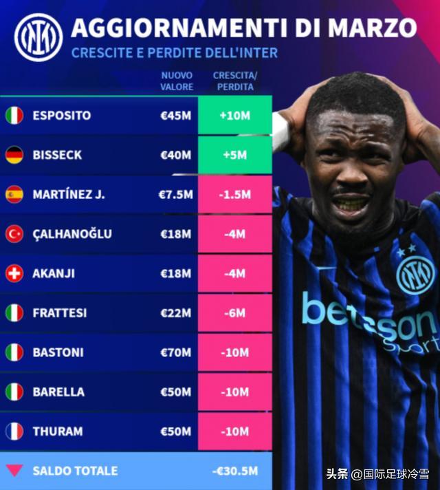 国米的身价下滑总值,比尤文图斯(下滑1600万)和AC米兰(下滑1000万)都高出很多,这引发了热议。