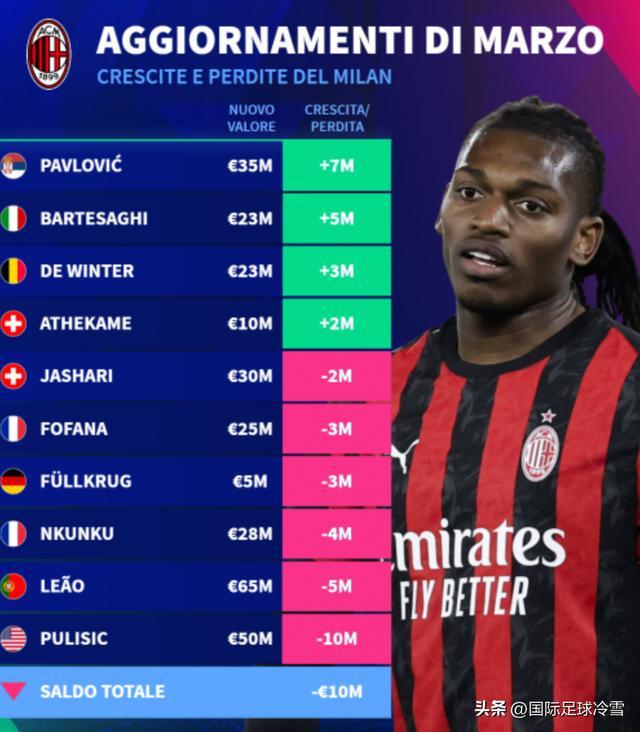而国米身价下滑的球员则多达7人之多。