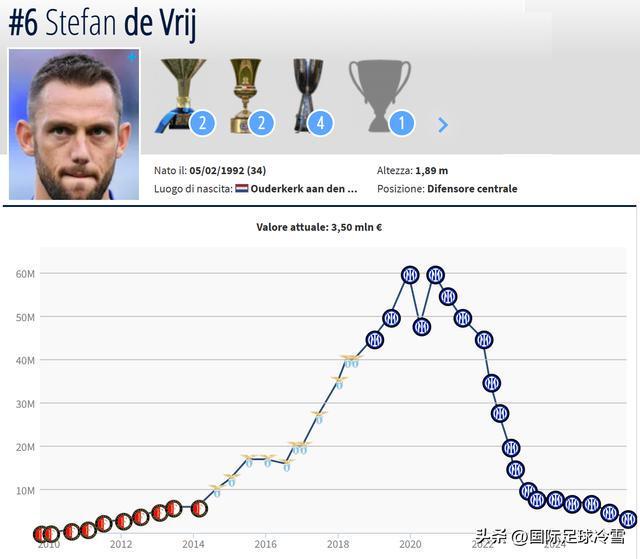 举个例子:国米后卫德弗赖,2020年时他的身价达到生涯巅峰的6000万欧元,在短短4-5年内,他的身价就下滑到了500万欧元(如今只有350万)。这固然与他在俱乐部,国家队的地位下滑有关,但根本的原因还是随着年纪的不断提升,他的身价每次更新都会下降——即便球员表现好的时候,也只是降的慢一点而已,趋势是不会变的。