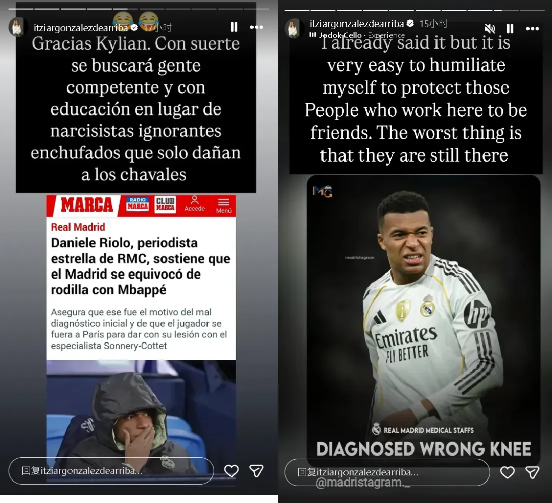 前皇马营养师伊齐亚尔·冈萨雷斯(Itziar González)曾在被皇马解雇后公开谴责俱乐部医疗团队,在姆巴佩膝伤误诊的消息传出后,冈萨雷斯再次发声谴责皇马的医疗团队,她在社交媒体上写道:“谢谢你,基利安,我希望这能促使俱乐部聘用有能力、训练有素的专业人士,而不是那些靠关系上位、自恋无能、只会伤害球员的人。虽然我不知道哪件事更糟糕:是这件事本身,还是他们计划使用免费的ChatGPT来制作运动补充剂这件事。”