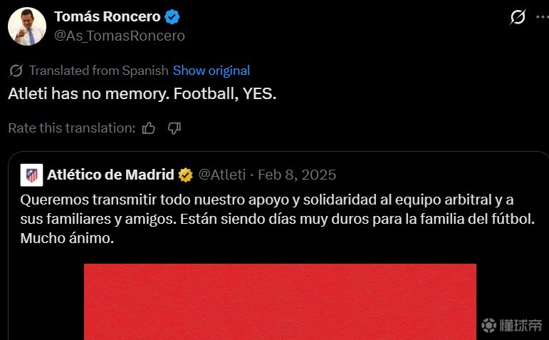北京时间3月25日,《阿斯报》主编龙赛罗在个人社交媒体上转发了一条马德里竞技于2025年2月8日发布的支持西甲裁判的帖子,以此讽刺马竞近期在德比赛后对裁判判罚的不满。
