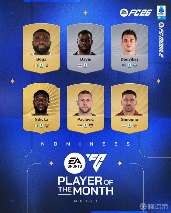 北京时间3月26日,意甲3月最佳球员候选名单公布,这6名球员为博加、凯南-戴维斯、杜维卡斯、恩迪卡、帕夫洛维奇、乔瓦尼-西蒙尼。