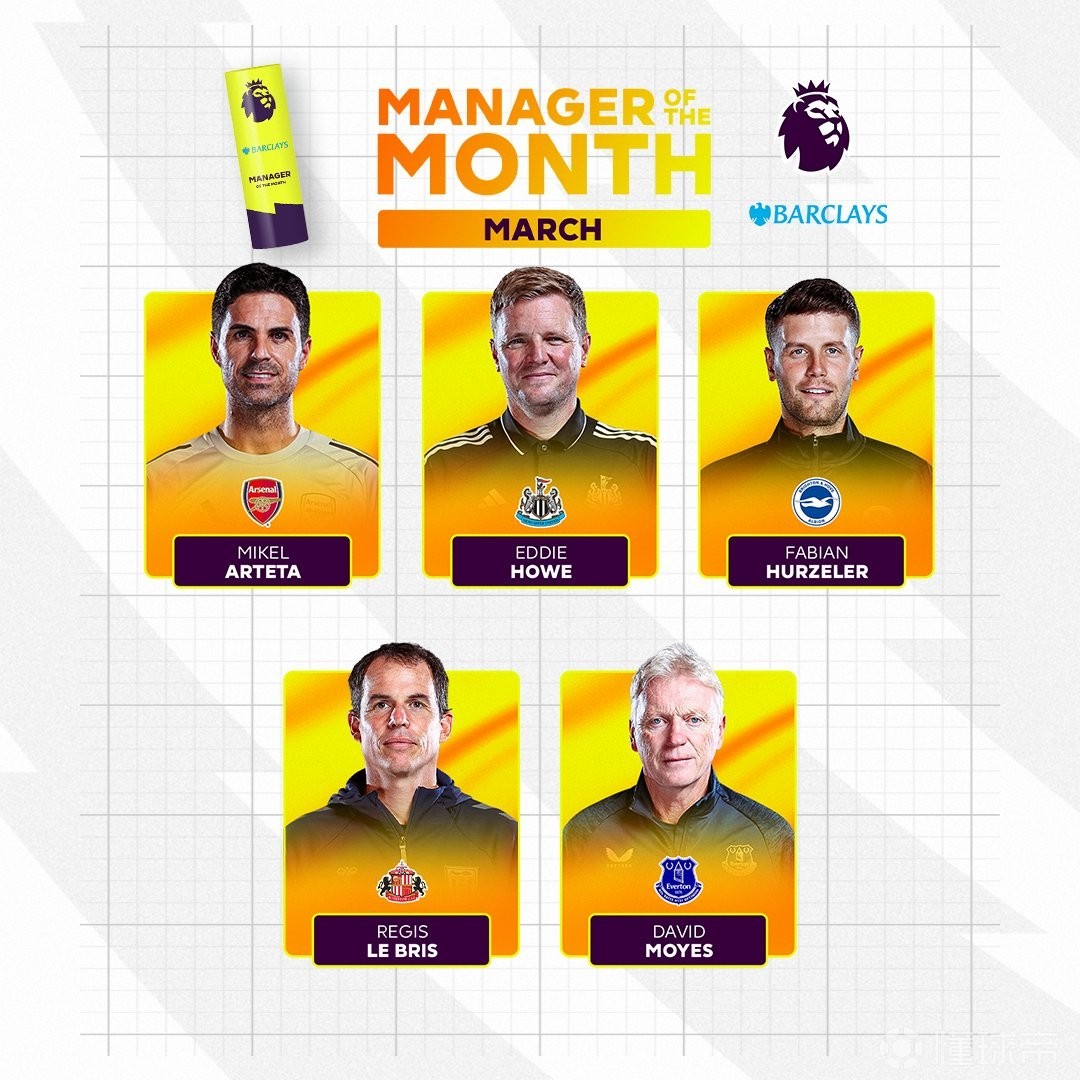 3月26日,英超官方公布了3月份最佳主教练候选名单,阿尔特塔领衔,埃迪-豪、莫耶斯、许尔策勒、勒布里斯在列。