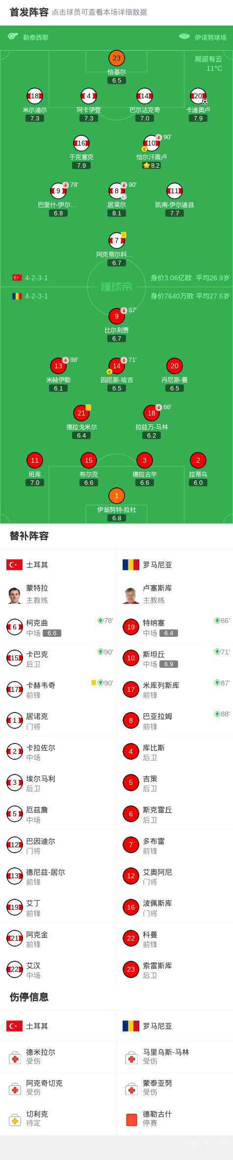 北京时间3月27日世界杯欧洲区预选赛附加赛半决赛,土耳其对阵罗马尼亚。下半场居莱尔右路传中,卡迪奥卢打入制胜球。最终比分土耳其 1-0 罗马尼亚。
