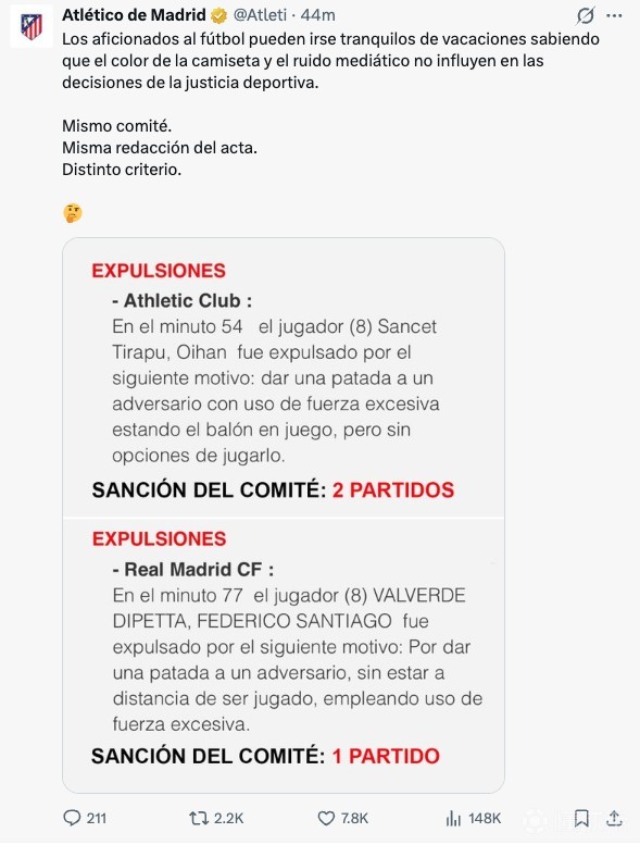 紧接着又发布了一条社媒表示:“足球迷们现在可以安心去度假了,因为他们知道,球衣颜色和舆论声量不会影响体育司法的判决,同一个委员会,同样的比赛报告表述,不同的标准。”