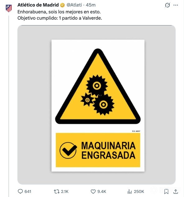 马竞发布这条社媒的同时配了一张机械设备已加润滑脂的标志图,图中配有文字:机械已上油(意为已保养。)