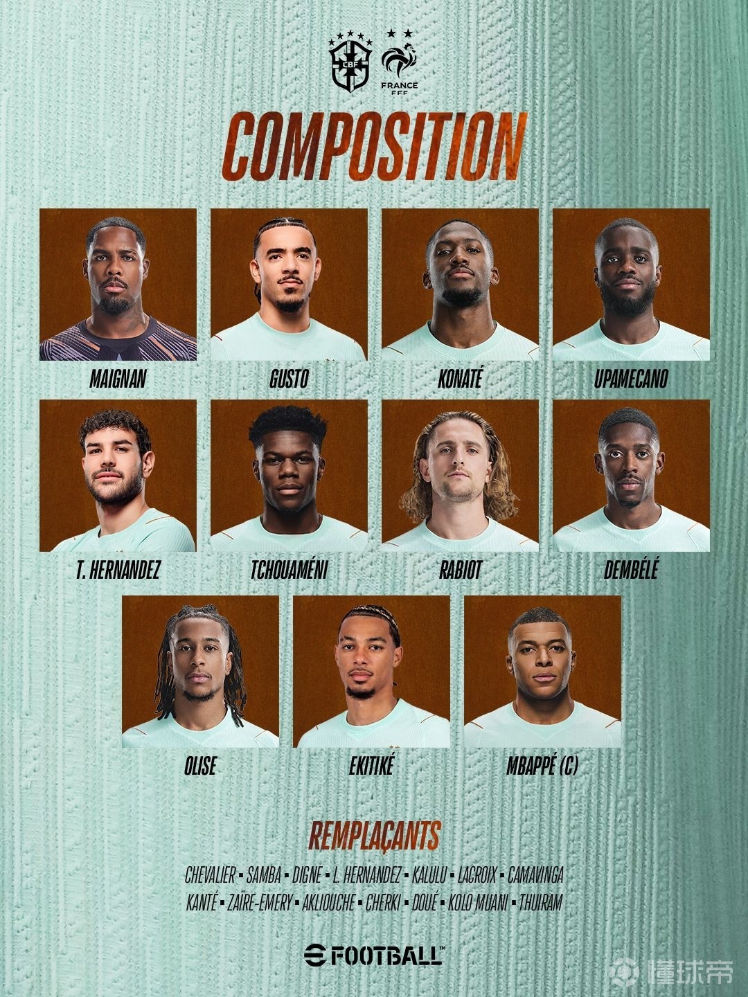 法国首发:16-迈尼昂、2-古斯托、4-于帕梅卡诺、15-科纳特、21-特奥-埃尔南德斯、8-楚阿梅尼、14-拉比奥、11-奥利塞、22-埃基蒂克、7-登贝莱、10-姆巴佩
