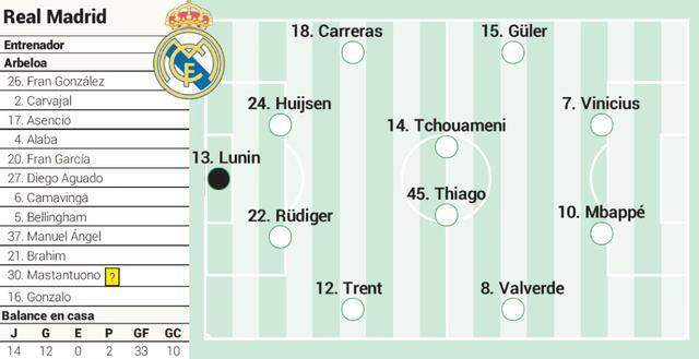 皇马预计首发十一人: 卢宁 / 特伦特、吕迪格、怀森、卡雷拉斯 / 巴尔韦德、蒂亚戈、楚阿梅尼、居莱尔 / 姆巴佩、维尼修斯