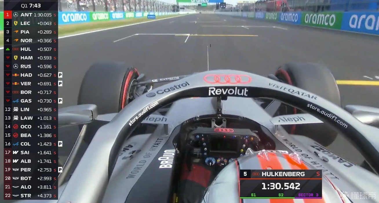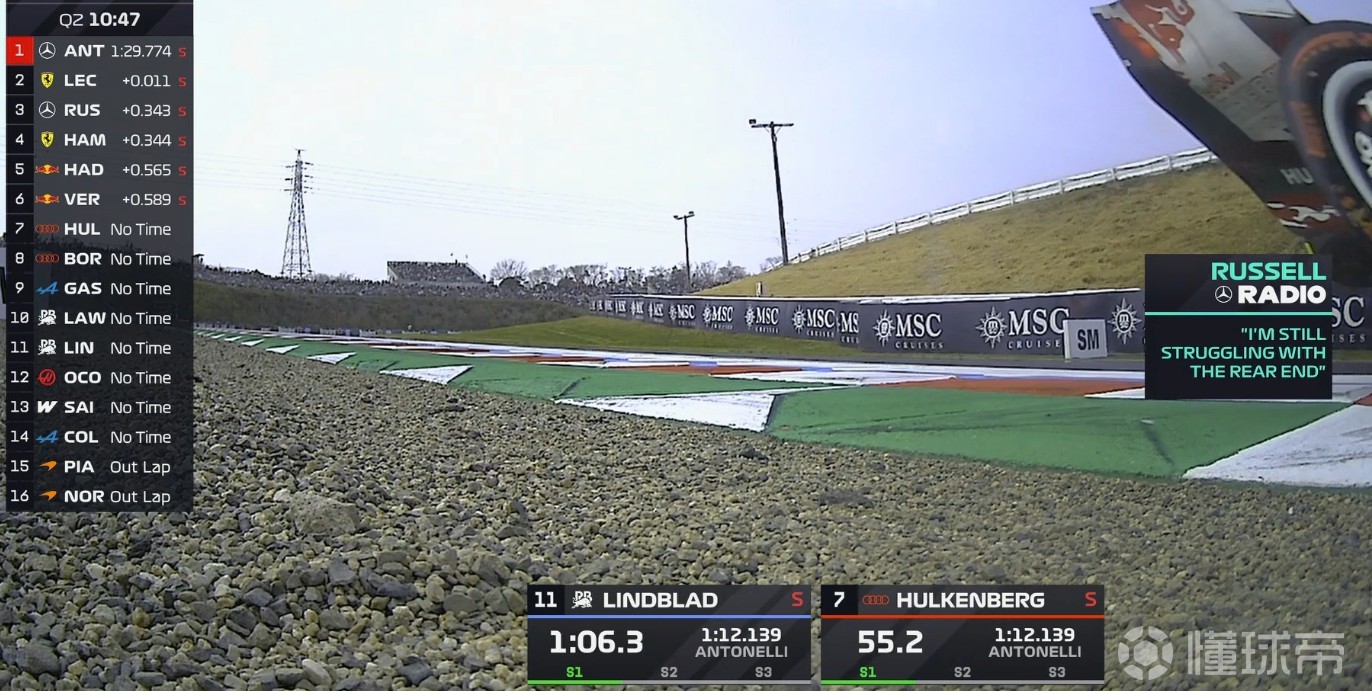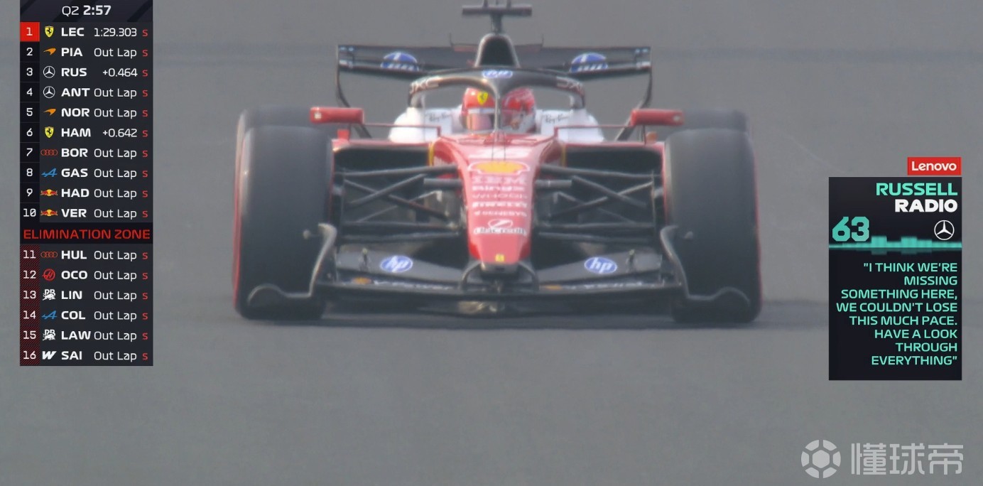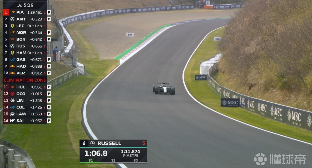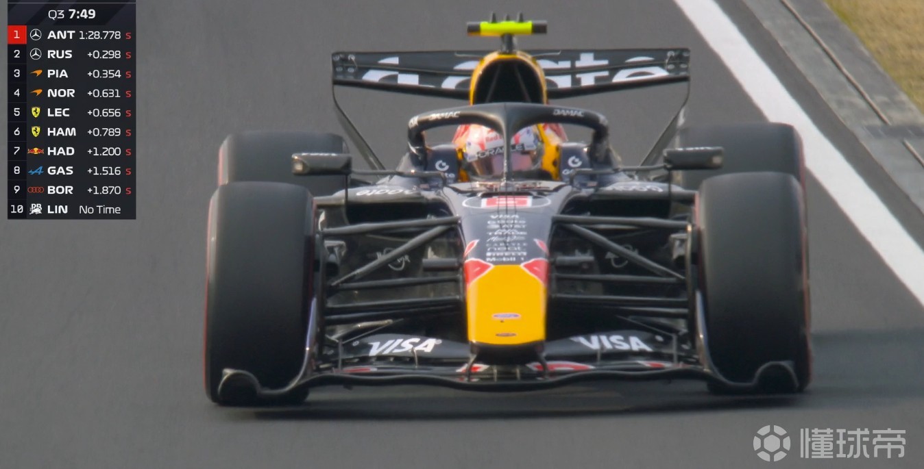 最终Q3结束,安东内利拿到杆位,拉塞尔第二,皮亚斯特里第三,勒克莱尔第四。