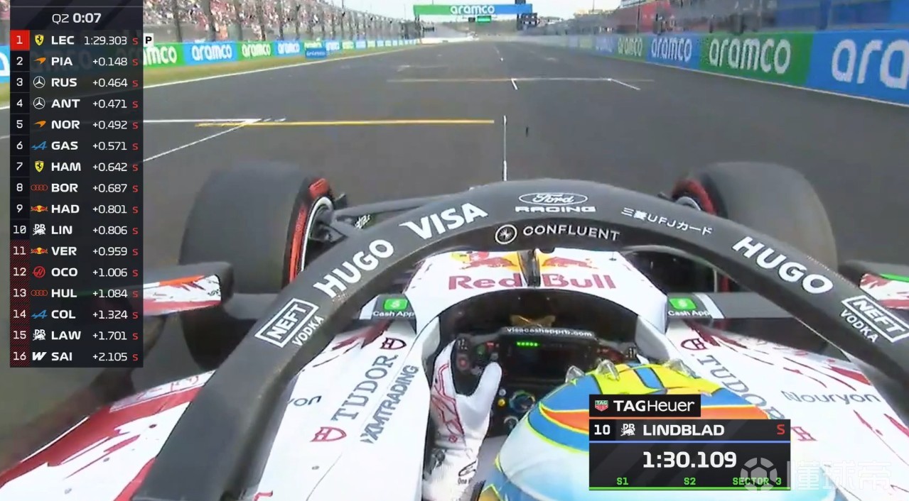 林德布拉德超越维斯塔潘来到P10,Q2淘汰车手:维斯塔潘、奥康、霍肯伯格、劳森、科拉平托、塞恩斯。