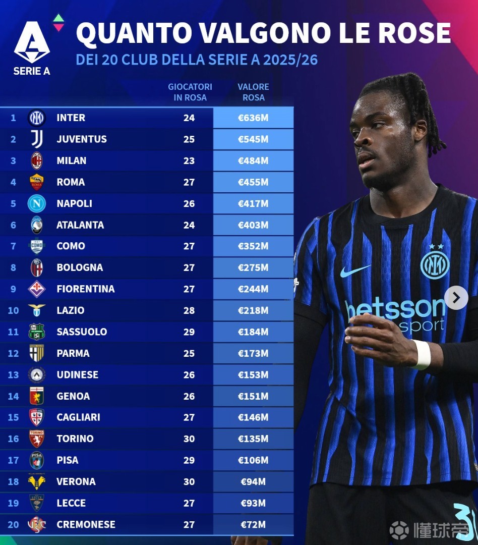 北京时间3月28日,德转列出了意甲20支球队最新的身价排行榜,国际米兰以6.36亿欧元排名第一,尤文图斯5.45亿欧元排名第二,AC米兰4.84亿欧元排名第三。