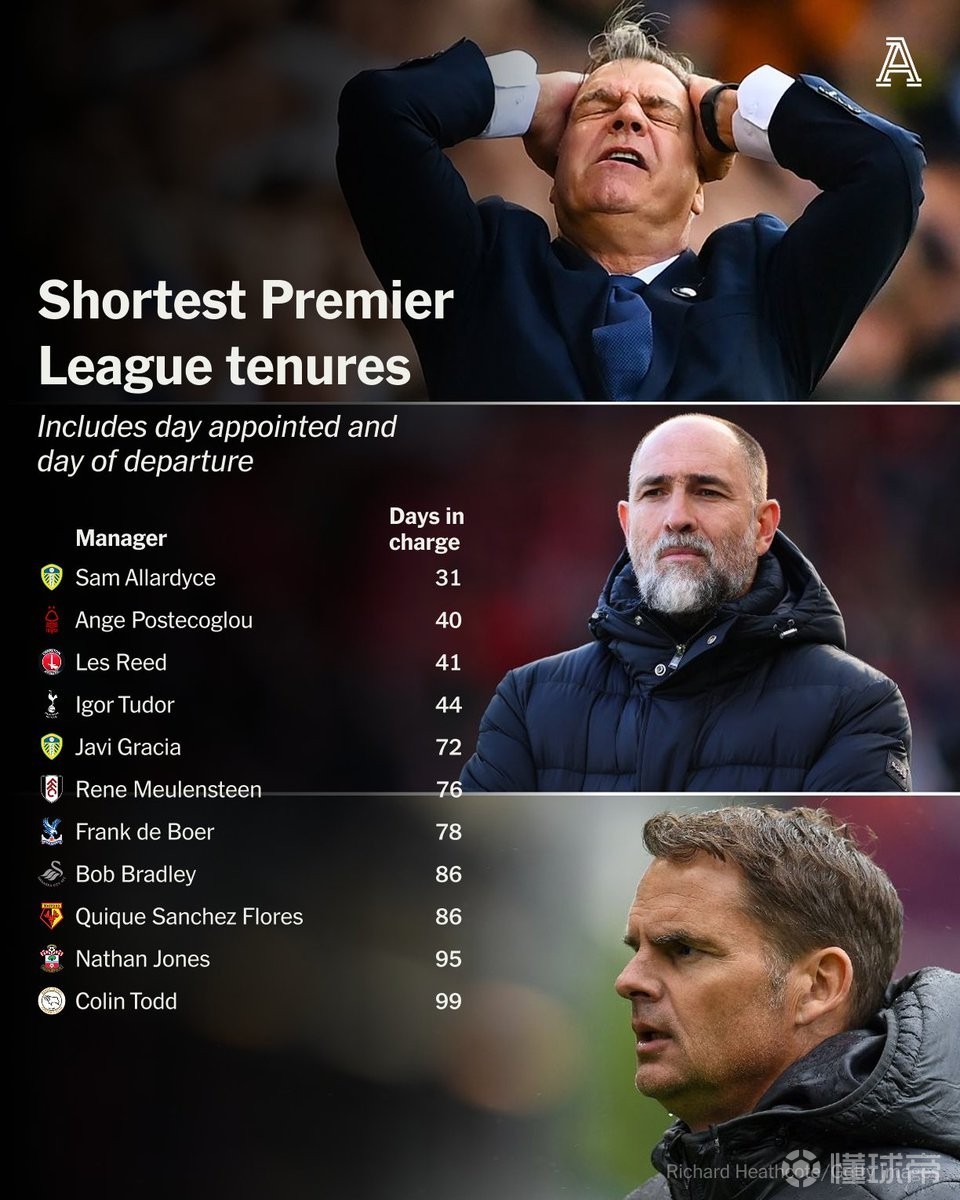 TA统计英超历史最短命主帅(包含任命和离任当天):