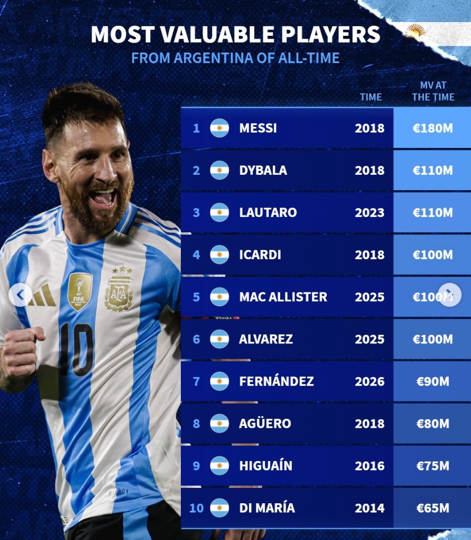 北京时间3月31日,德转列出了阿根廷球员历史身价榜,梅西1.8亿欧元第一,迪巴拉和劳塔罗同以1.1亿欧元并列第二,伊卡尔迪、麦卡利斯特、胡利安-阿尔瓦雷斯1亿欧元。