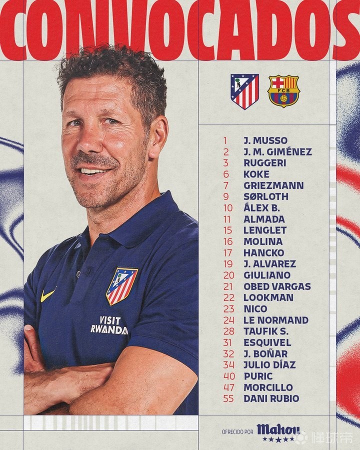 西甲第30轮焦点战,马竞主场迎战巴萨。赛前马竞官方公布了本场比赛的大名单:格列兹曼、阿尔瓦雷斯领衔;奥布拉克、略伦特、门多萨等多名球员缺席,多名青训小将入选。