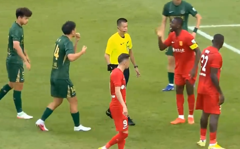 比赛的第30分钟,米特里策推倒李镇全,随后被阿马杜铲倒,引发了双方球员的冲突。在双方冲突结束之后,主裁判判罚给浙江队任意球,米特里策主罚的任意球势大力沉,直接将人墙里的阮奇龙击倒在地。